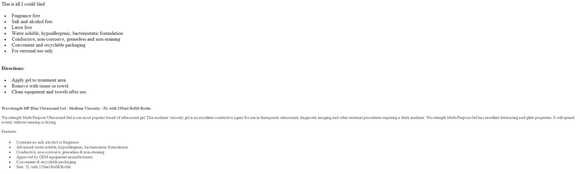 5 Liter Multi-Purpose Ultrasound Gel. Salt free, fragrance free, alcohol free and formaldehyde free it's water soluble, hypoallergenic, and bacteriostatic.